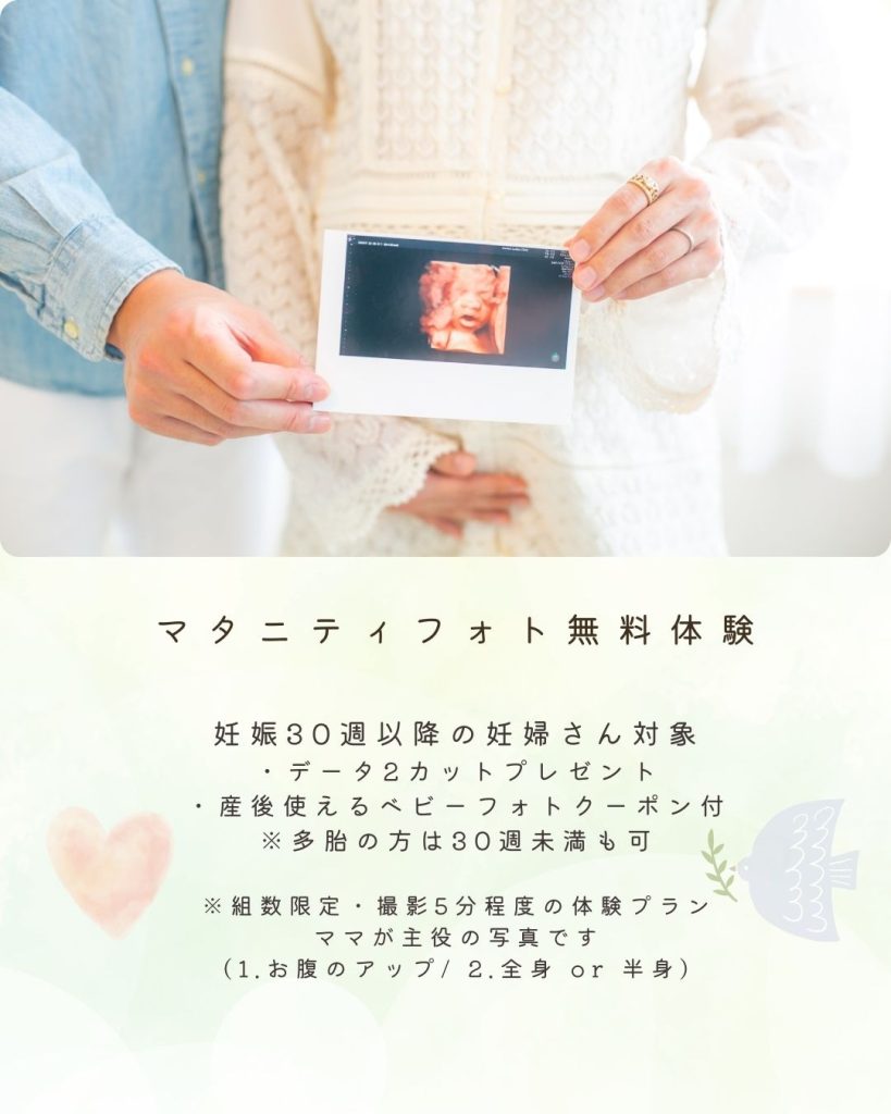 妊娠30週以降(多胎の方はそれ以前でも可)の妊婦さんを対象にした、マタニティフォト無料体験も同時開催
