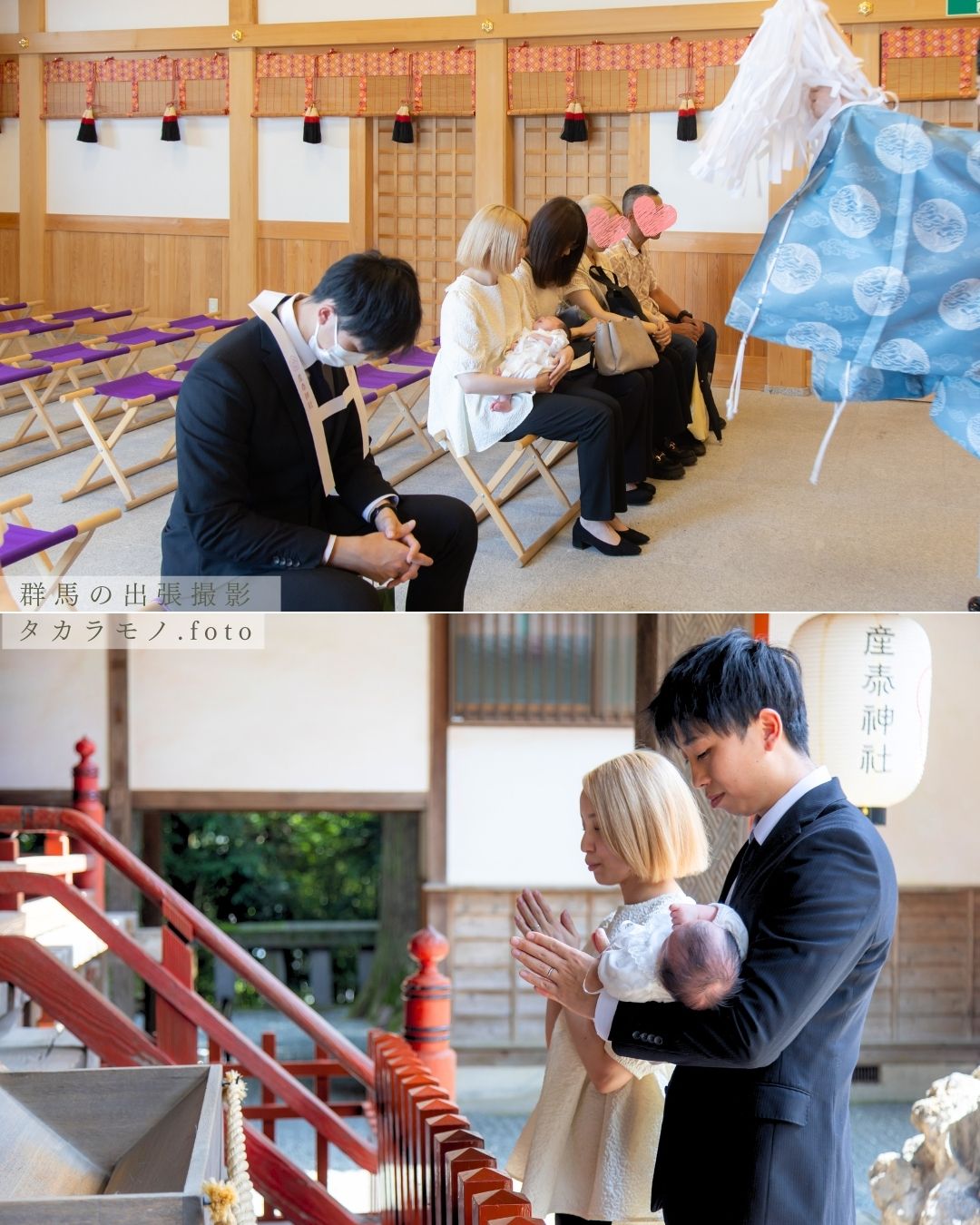 神社でのお宮参り撮影赤ちゃんの健やかなご成長を願ってご家族の絆を記録します。 全データ80カット以上お渡しカメラ目線だけでなく、ママとお子様の2shotや、祖父母様…
