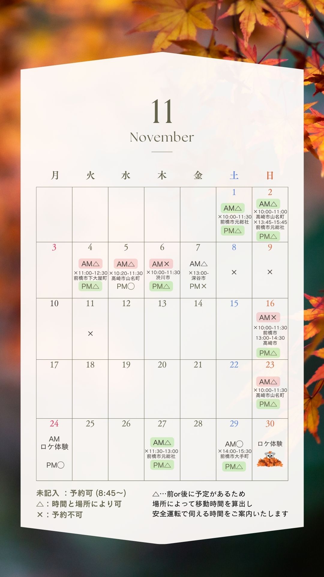 - △は場所・時間により承れます。詳細はLINEメッセージかお電話からお問い合わせください。先約がある日でも、同じ神社や近隣であれば、前後のお時間にすぐご案内可能な場合もあります。離れた場所は、安全に余裕をもって伺える時間をご案内いたします。